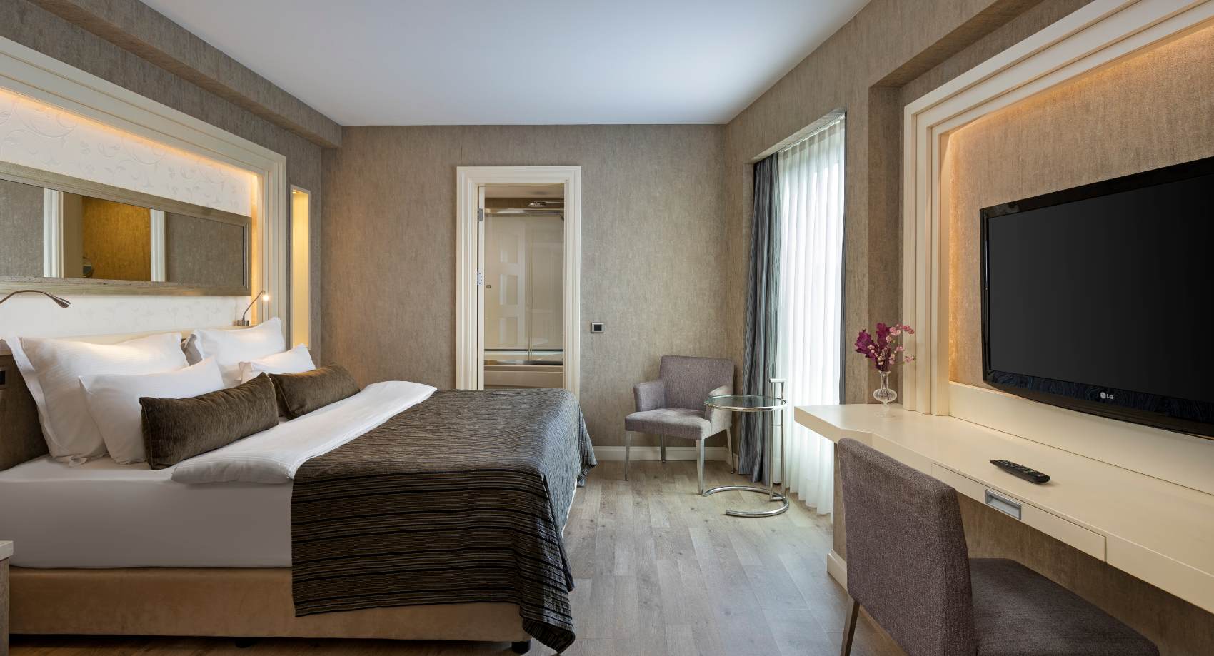 Averaging 56 m2 (1 bedroom, 1 living room, 2 bathrooms), Luxury Suites are decorated with a working desk, an armchair, a daybed sofa, premium class comfortable beds, 42-inch interactive TV in living room, 32-inch interactive TV in bedroom, jacuzzi, complimentary in-room coffee and tea making facilities, espresso machine, laptop size room safe, rain shower, floor heating and sound system in bathrooms, personalised climate system, free high-speed Internet access.